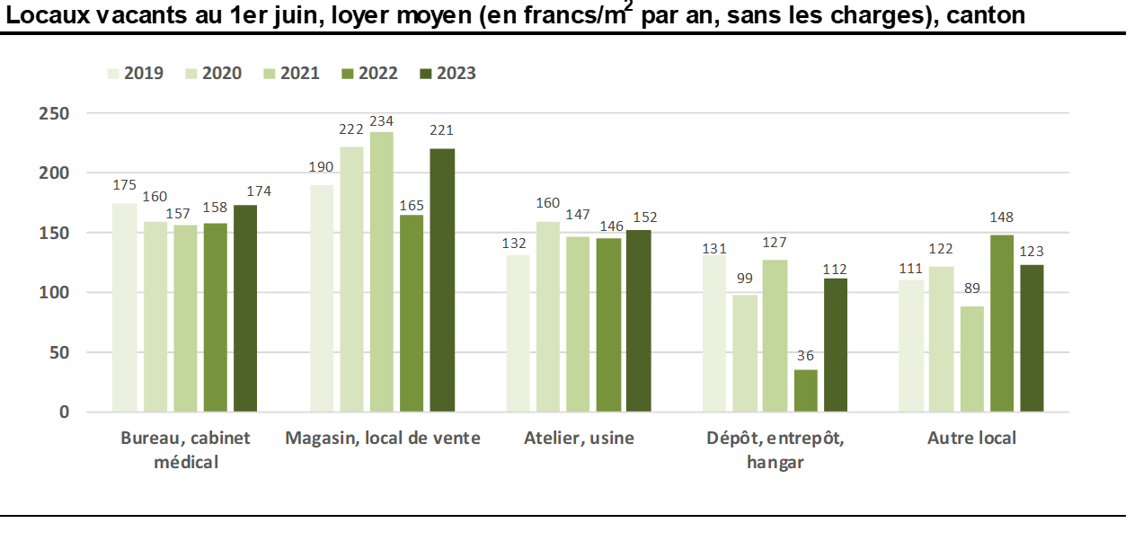 Par rapport au 1er juin 2022, la seule baisse de loyer est constatée pour les « autres locaux vacants » (-25 francs/m2) alors que toutes les autres catégories de locaux vacants présentent une augmentation de leur loyer, la plus forte étant celle concernant les « dépôts, entrepôts, hangars » (+76 francs/m2).